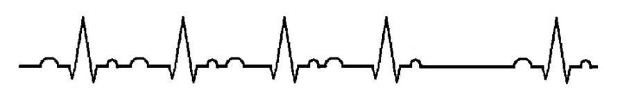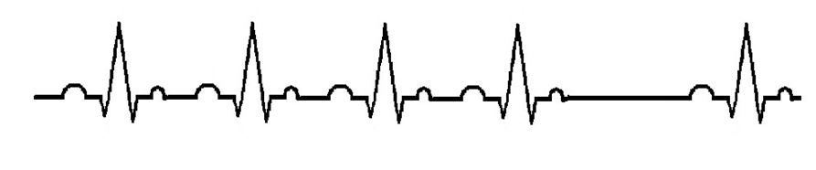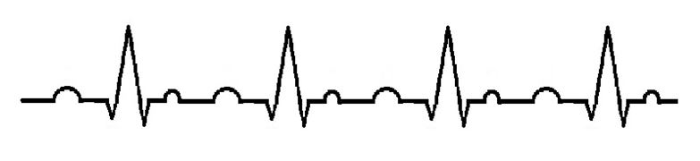 The third degree block is the most dangerous of the three types. It is where the SA node and the AV node are working out of sync. The SA node is still sending an impulse, but the AV node is not picking it up and the Bundle of His is generating escape beats in order to keep the ventricles operating. This will be recognized in the ECG as two separate rhythms. The P-P interval (measurement from P wave to P wave) will show one rhythm and the R-R interval will show another.